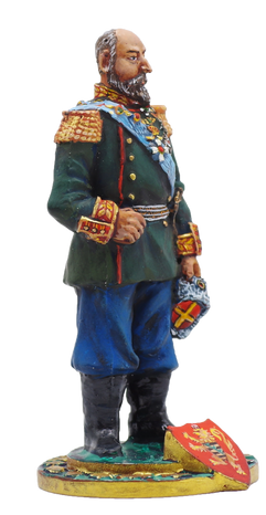 The prince is dressed in the uniform of a general of the Bulgarian Army. He wears the collar of the Order of Saint Alexander, as well as the sash and neck badge of the Order of Bravery. On the prince's chest there are stars of the two Bulgarian and one dynastic orders: the Order of Bravery, Order of St. Alexander and Saxe-Ernestine House Order.