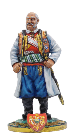 The prince is dressed in the traditional ceremonial uniform of the Montenegrin Army. He wears the sash of the Order of Prince Danilo I, as well as the badge of the Order of Petrovic Njegoš around his neck. On the prince's chest there are stars of the Order of Prince Danilo I and Russian Order of St. Andrew the Apostle the First-Called.