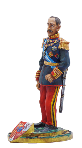 The king is dressed in the uniform of Captain General. He wears the collar and sash of the Royal and Much Distinguished Order of Charles III, as well as the collar of the Distinguished Order of the Golden Fleece. On the king’s chest there are stars of the highest Spanish orders: the Order of Charles III, Order of Isabella the Catholic and the Spanish military orders: Order of Santiago, Order of Calatrava, Order of Alcántara and Order of Montesa.
